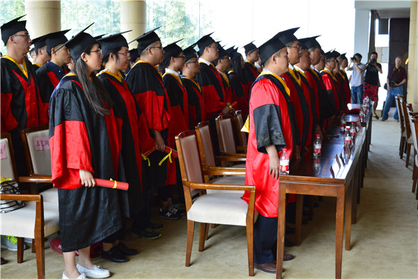 学位授予仪式在庄严的国歌声中拉开了序幕,首先吴林志教授宣读了博士学位授予决定。随后校长姚郁和各院系院长、副院长为包括王耀、张剑伟、王猛在内的共128名博士生一一授予了博士学位并进行了合照。然后博士生代表董国忠进行了发言,表达了对母校的热爱与感激之情。紧接着博士生导师代表程建华教授进行了发言,他表示同学们虽然获得了人生的最高学位,但在不管在什么行业,都要有严谨认真的工作作风,不忘母校教诲。最后,校长姚郁进行了致辞,他表示同学们要谨记老师的教诲并希望同学们在以后的道路上不懈努力,鹏程万里。
