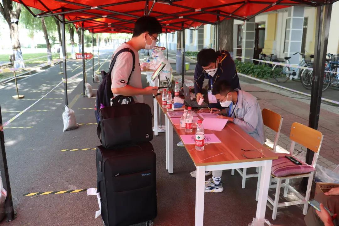 工作人员在公寓外严阵以待,对返校报到学生进行信息登记、测量体温、检查龙江健康码、通信大数据行程卡。消毒行李箱、涂免洗洗手液,也是本次报到的必备环节。