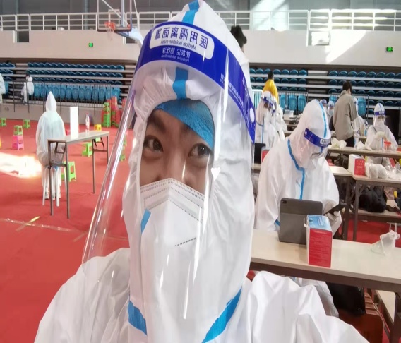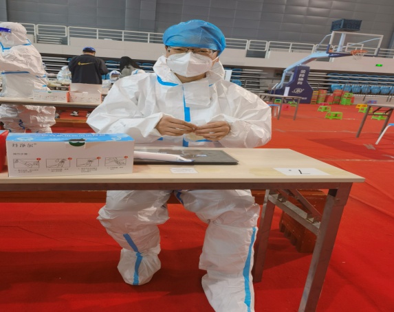 本次校内核酸检测工作志愿者主要是承担核酸检测扫码工作,志愿者们完成上岗培训之后就开始进入了工作岗位。信息录入并不复杂,可以通过扫码或者将检测人的信息输入完成,但是志愿者们都要穿着厚厚的防护服和防护面罩,一个班4个小时的时间里,大家是不能上厕所的。因此,志愿者们上岗前都尽量少吃少喝,工作期间全程不喝水。