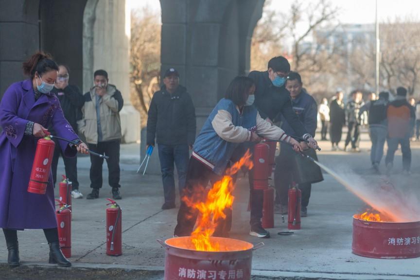 安全撤离后,学院领导、各部门教职工和学生在11号楼南门一侧区域参加灭火器使用培训并亲手实践,学校安全保卫处叶远康老师为大家示范如何正确使用灭火器、掌握扑灭初期火灾的方法。