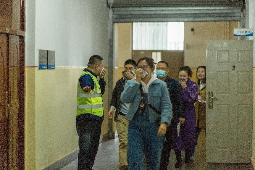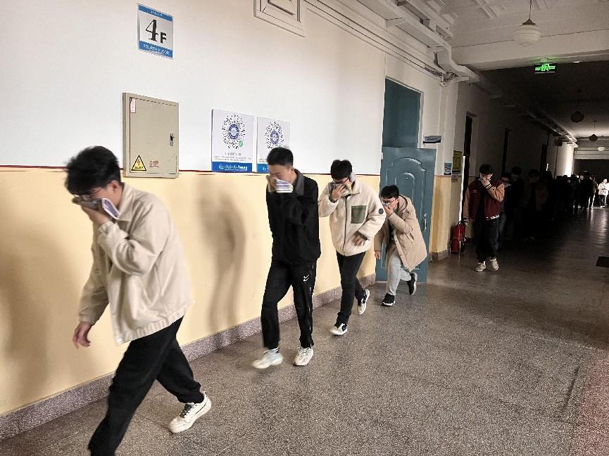 会后,全员进行火灾疏散逃生的实战演练,参演教职工、学生在消防疏散员的引导下,用湿毛巾捂住口鼻,低头弯腰、单列靠右,迅速按照疏散通道方向,安全有序地疏散到指定区域。
